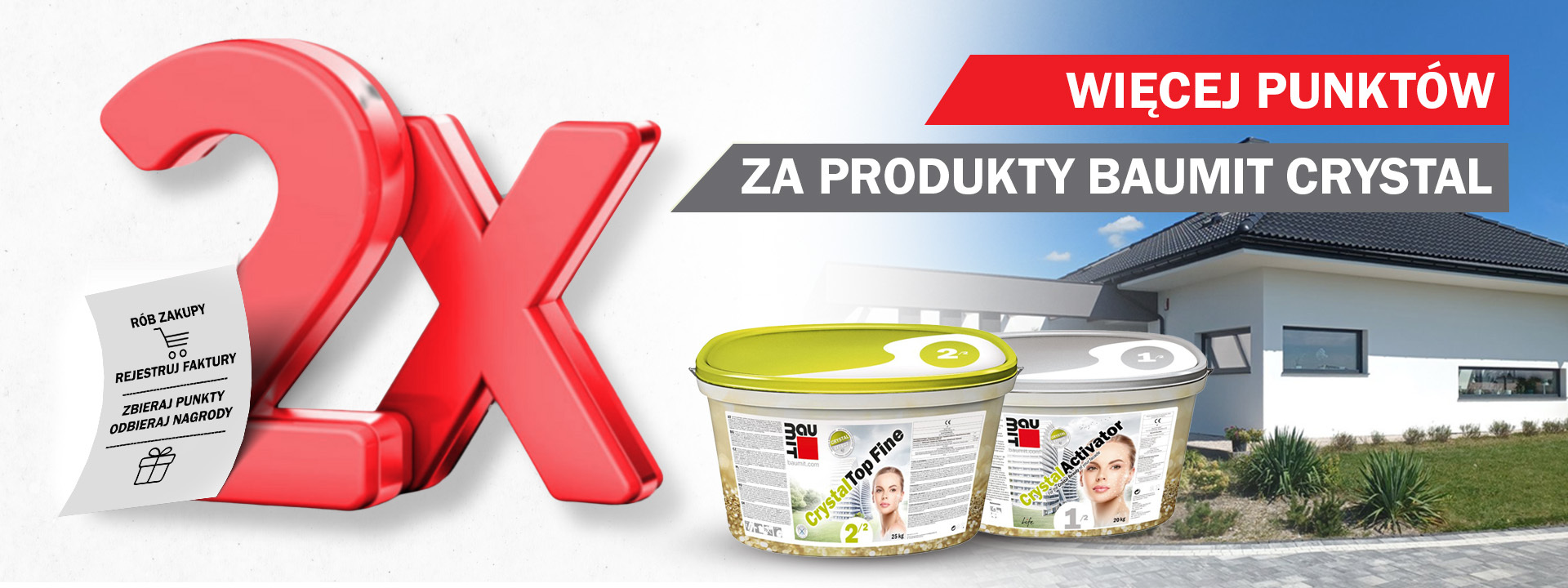 Klubowiczu, nie przegap swojej szansy na zdobycie dodatkowych punktów w Baumit Klub. Wystarczy, że w dniach od 1 sierpnia do 31 października kupisz Baumit CrystalTop lub Baumit CrystalActivator i prawidłowo zarejestrujesz z nimi fakturę w programie, a na Twoje konto trafi 2 x więcej punktów za każdy kubeł widoczny na dokumencie sprzedaży.